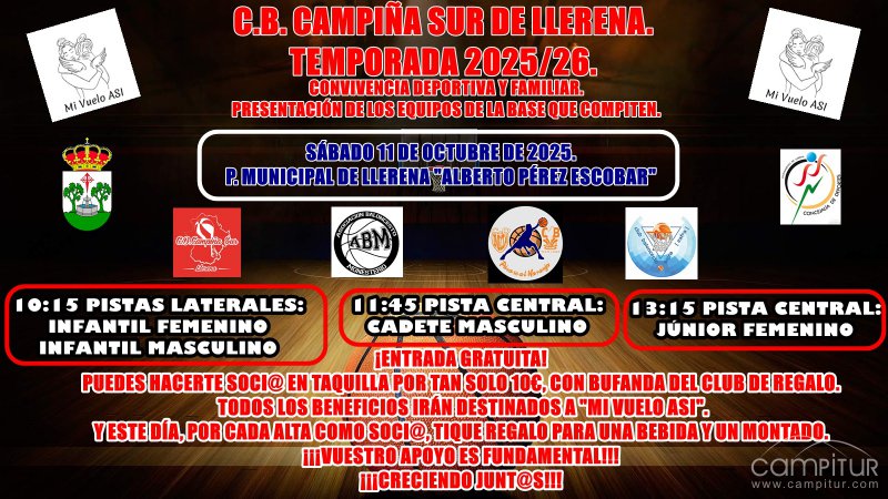 La mañana del sábado 11 de octubre de 2025, tendrá lugar la puesta de largo de los equipos de la cantera del C.B. CAMPIÑA SUR DE LLERENA, que competirán esta próxima temporada en JUDEX: INFANTIL FEMENINO Y MASCULINO, CADETE MASCULINO y JÚ]NIOR FEMENINO. Esta temporada, al igual que la pasada, volvemos a dar un paso importante más. Volverá a ser no solo una CONVIVENCIA DEPORTIVA, será también una CONVIVENCIA FAMILIAR, en la que los jugadores, entrenadores, familias de todos los equipos de nuestro club (también los y las que quieran participar de nuestr@s amig@s de MONESTERIO, VILLANUEVA DE LA SERENA y ZAFRA) y soci@s, compartamos tiempo, espacio y diversión también fuera de las pistas. A partir de las 14:00 hs., habrá servicio de barra en la CASETA MUNICIPAL DE LLERENA. El servicio de barra, irá a cargo de PUB CHAPLIN (CRISTIAN Y PATRICIA). Habrá carne con tomate, carne en salsa, montaditos, pinchitos, paella, jamón y queso, a precios económicos. Además, desde el club, a todo aquél que se haga socio/a en el evento (tanto en el pabellón como en la caseta municipal) se le entregará un tique para una bebida y otro para un montado de lomo o pinchito.