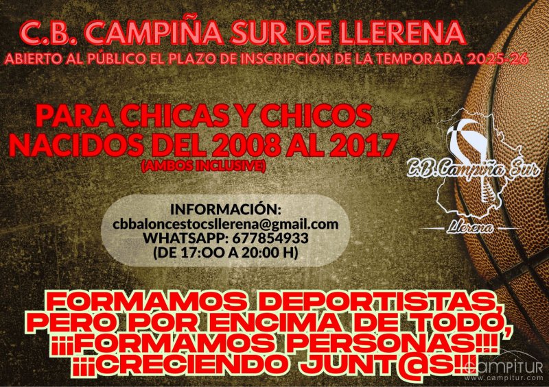 Los niños y niñas nacidos entre 2008 y 2017 que deseen formarse como jugadores, crecer como personas y unirse a la familia del C.B. Campiña Sur de Llerena pueden hacerlo informándose en el teléfono 677 854 933 (de 17:00 a 20:00 h en días laborables).