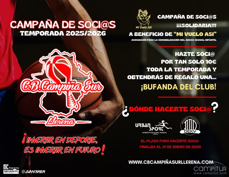 Desde el miércoles 15 de octubre de 2025 hasta el sábado 31 de enero de 2026, queda abierta oficialmente la CAMPAÑA DE SOCI@S del C.B. CAMPIÑA SUR DE LLERENA TEMPORADA 2025/26. Desde el club, agradecemos enormemente el tiempo, trabajo y creatividad que ha dedicado un año más nuestro compañero Juan M. Barragán, para realizar este magnífico cartel y a IMPRENTA GRANDIZO, por su colaboración incondicional. Por supuesto, agradecer a URBAN SPORT y CALZADOS-DEPORTES DEKY por, una temporada más, colaborar de manera incondicional con nuestro club.