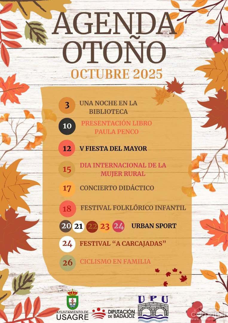 El Ayuntamiento de Usagre, con la colaboración de la Diputación de Badajoz y la Universidad Popular de Usagre, ha preparado una completa Agenda Cultural de Otoño que llenará de vida el municipio durante todo el mes de octubre de 2025.
